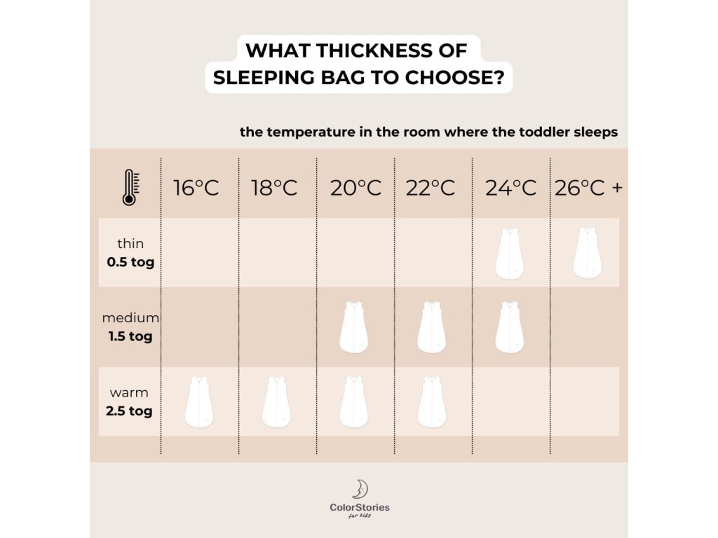 Stupnice TOG je měřítkem toho, jak dobře materiál nebo výrobek izoluje teplo. Čím vyšší je hodnota TOG, tím více tepla poskytuje. Pokud například vidíte, že spací pytel nebo přikrývka má vysokou hodnotu TOG, znamená to, že vás více zahřeje a bude ideální pro zimní večery. Nezapomeňte, že stupnici TOG spacího pytle volíme podle teploty místnosti, ve které dítě spí, nikoli podle počasí nebo venkovní teploty.