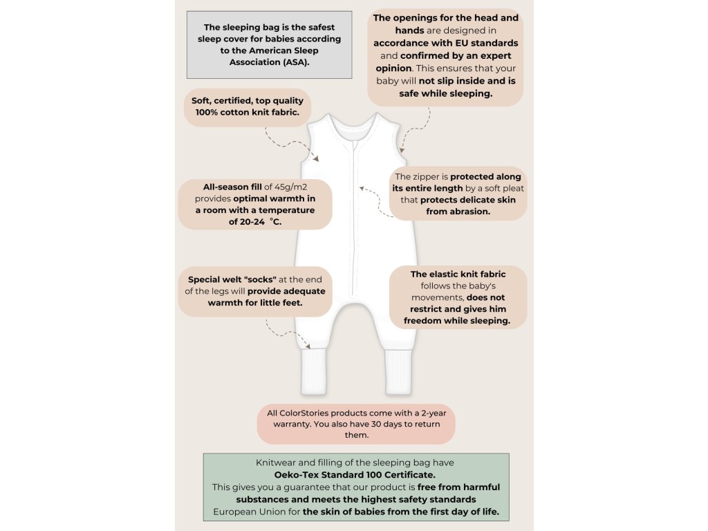 Spací pytel s nohavicemi ColorStories je nejbezpečnější a nepostradatelný pomocník pro aktivní batolata! Zajistí vašemu děťátku volnost pohybu, zároveň se nemusíte bát, že by se vaše dítko v noci odkopalo.